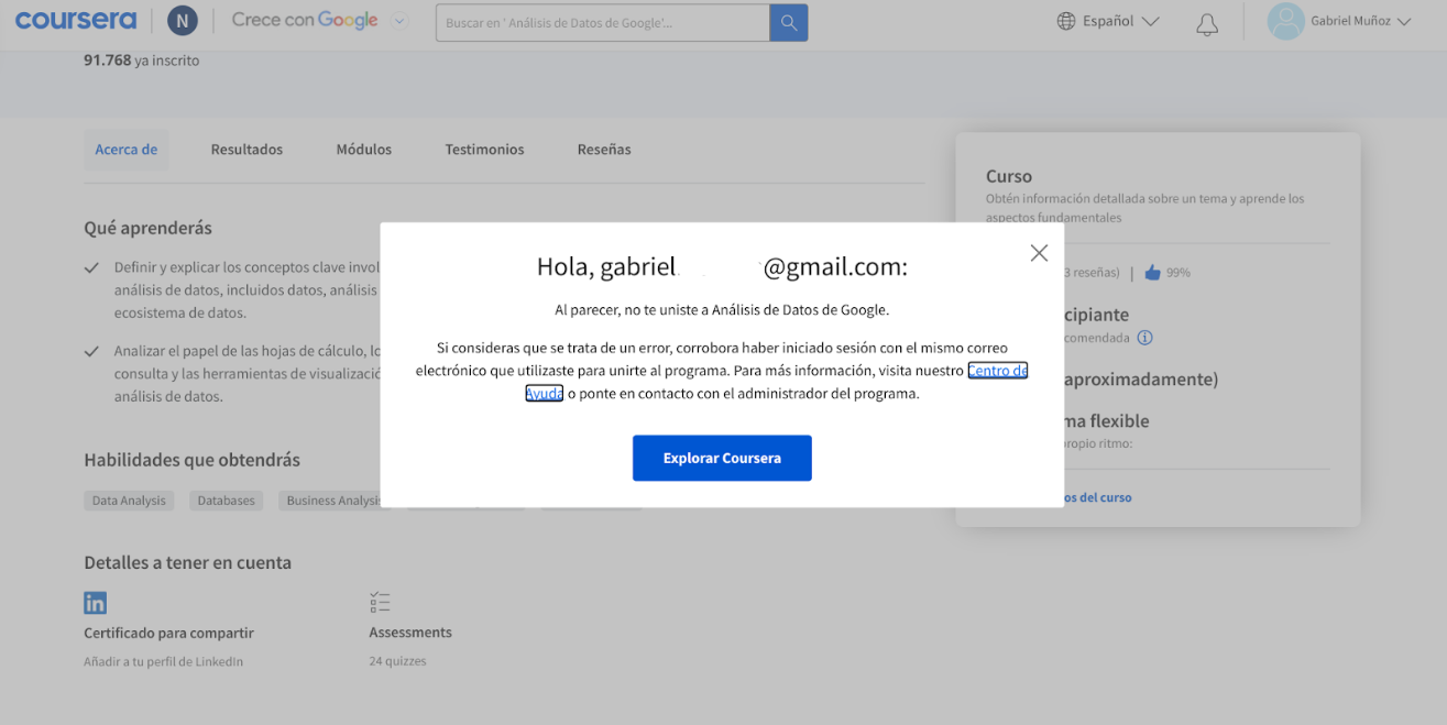 Lo siguiente es unirte a tu Certificación, lo puedes realizar desde tu correo o desde los siguiente vinculos que dejaremos para ti, recuerda que solo te puedes unir a la certificación que solicitaste, si entras con uno de los vínculos y no te encuentras invitado se muestra la siguiente pantalla. Es indispensable crear tu cuenta en Coursera utilizando la cuenta de correo con que te registraste.